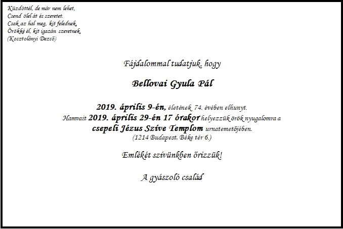 Értesítjük mindazokat, akik ismerték és szerették, hogy Bellovai Gyula kollégánk elhunyt. Gyuszi régi szakszervezeti tagunk és tisztségviselőnk volt, a HM Ellátó Igazgatóságán dolgozott. HODOSZ Tanácstagként aktív szószólója volt a honvédségi civil dolgozók érdekeinek. Nyugdíjas évei alatt az 501. számú HODOSZ alapszervezet titkáraként és nem utolsó sorban a HODOSZ Európáért Alapítvány kurátoraként végezte áldozatos társadalmi munkáját.